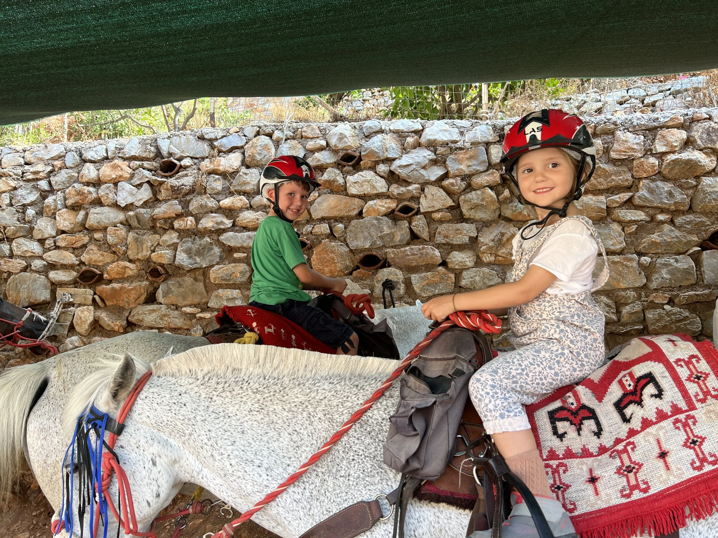Due to a cancellation, we were lucky to get a spot on one of the popular Harriet’s Hydra Horses tours – she is usually booked up throughout the summer. Harriet took us on a thoroughly enjoyable 1.5 hour tour of the town. After getting saddled up we rode to the church that sits above Hydra to take in the view. We then came back down the mountain and wound our way through the town’s narrow streets and back to Harriet’s stables. It was such a unique way to visit this quaint town, and made a nice change from being on the water. Not only does Harriet take the upmost care of her horses, she was also wonderful at putting the kids at ease. They were so brave and had such a positive experience that I think we may be swapping the boat for a horse, not a house!