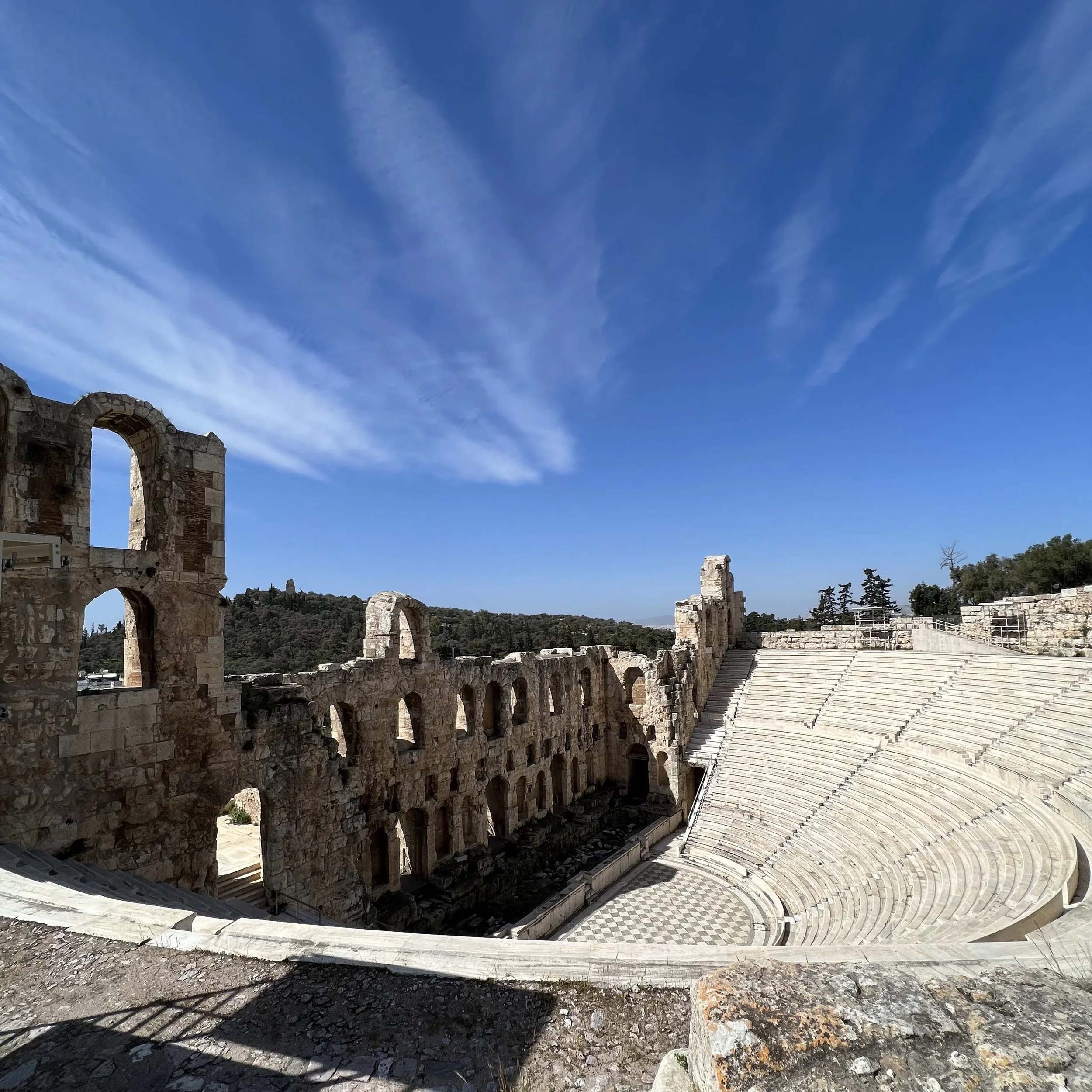 Throughout the city of Athens, the Romans have made their mark. Built in 161 CE, the Odeon of Herodes Atticus on the southwest slope of the Acropolis was a music and festival venue. The three-story stone front wall once held up a wooden roof made of expensive cedar of Lebanon timber. Today the renovated structure is still used as a concert venue.