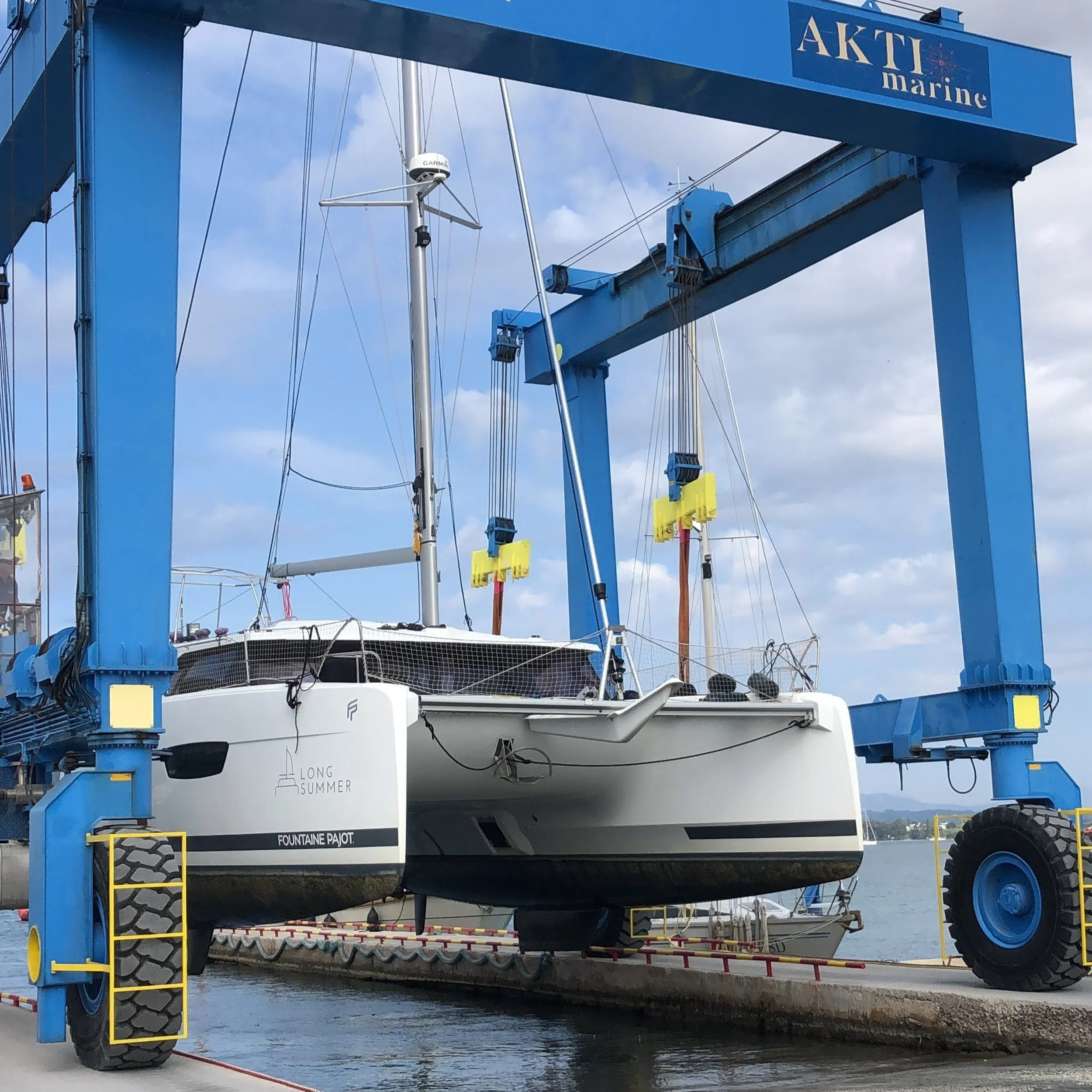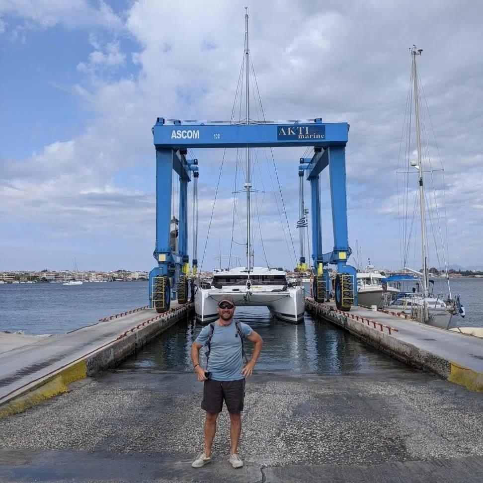Before we left Long Summer behind in Greece for the off-season, we had to get her out of the water and stored in a boat yard. Seeing your home fly through the air is a very surreal experience!