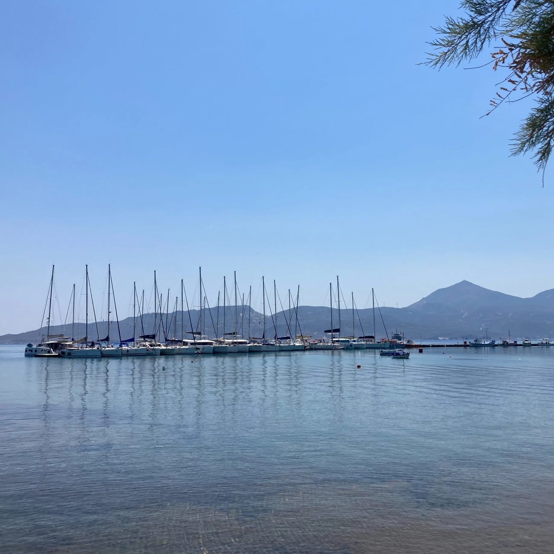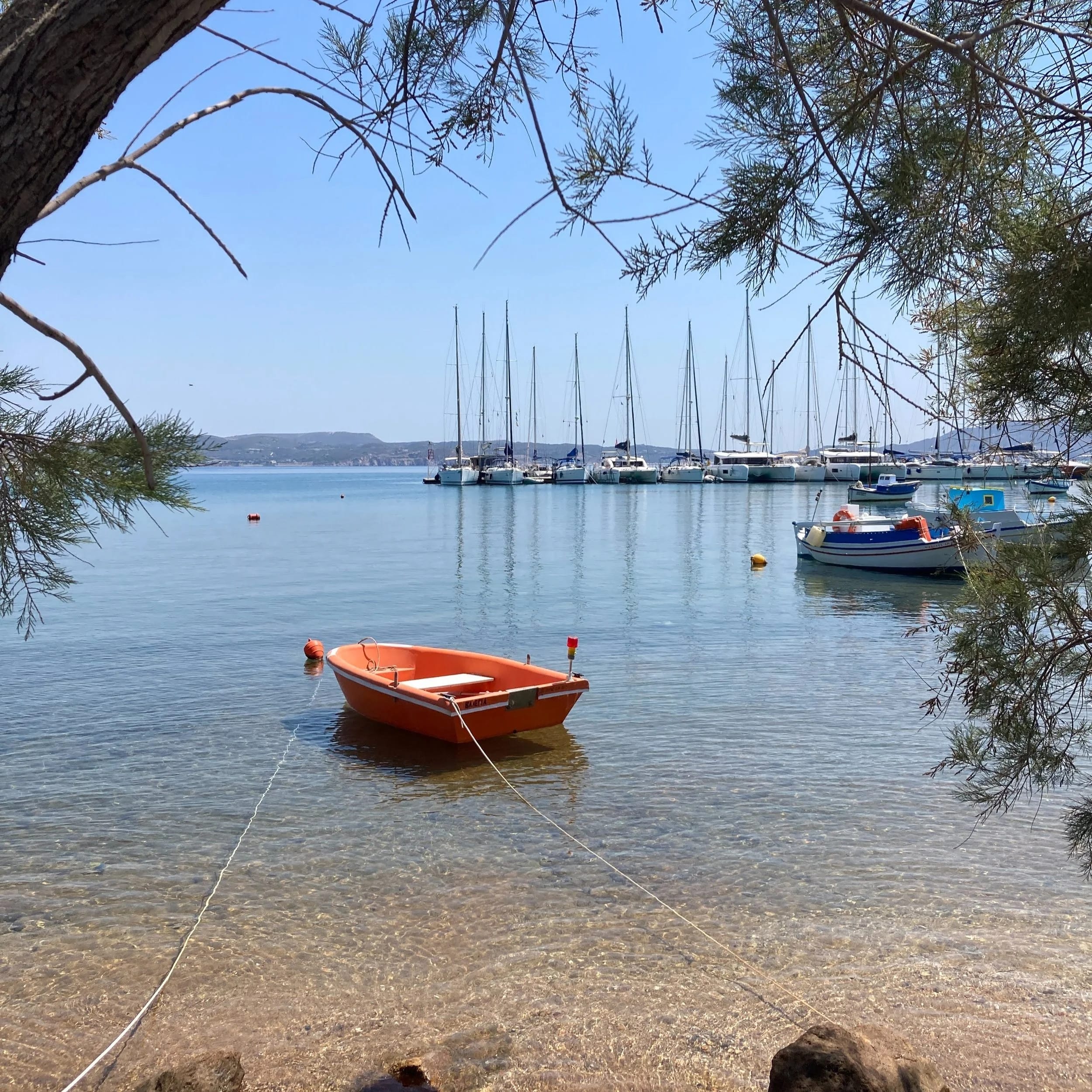 Tied up in Adamantas on the island of Milos. This harbour town sits on the edge of one of the largest natural bays in the Mediterranean, and is actually the flooded principal crater of this volcanic island. The volcanic activity here shaped the rocky coastline of the island and created valuable rocks that are still being mined here after thousands of years.