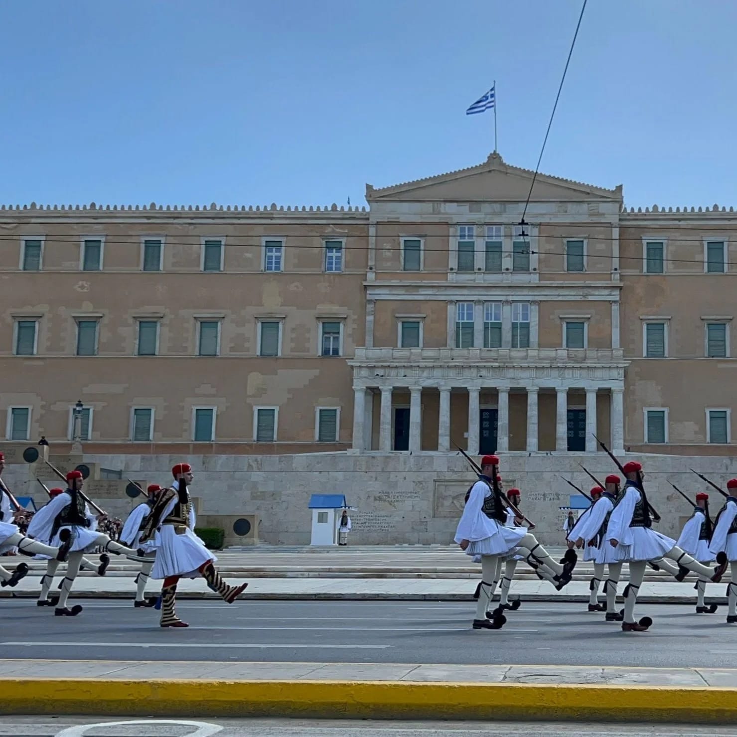 Before the change of shift, the main street is closed and a military marching band delivers replacement guards from their barracks. Unlike any other guard ceremony in the world, the slow procession resembles The Ministry of Silly Walks (yet much more profound), as the Evzones soldiers move to their post in the most flamboyant of choreography, each high-kick dance movement symbolic.