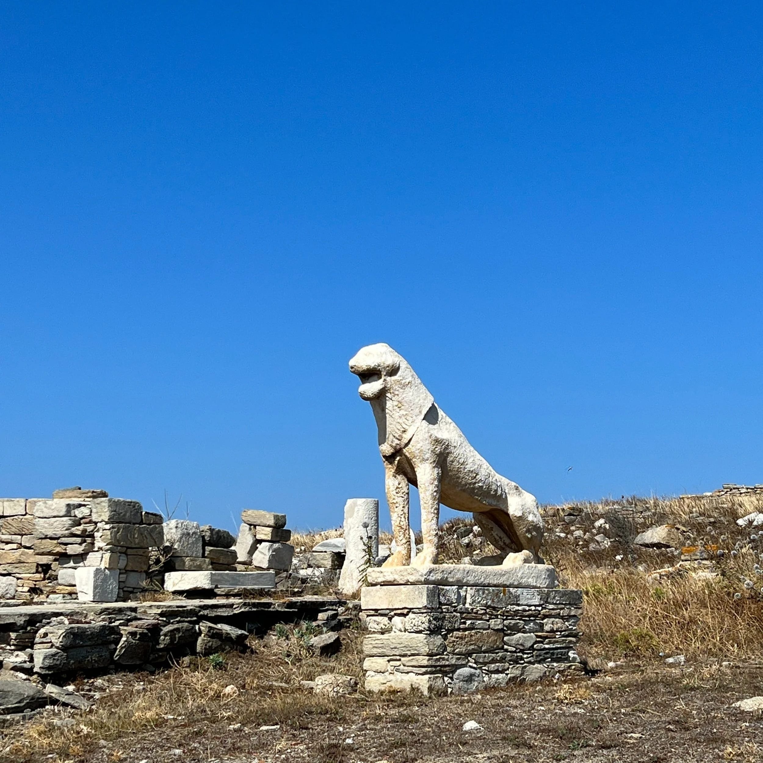 This extensive archaeological site is on par with Pompeii for conveying a complete image of a once-great cosmopolitan Mediterranean city. Unfortunately the island’s archaeological museum is currently closed for renovations, but we spent the morning exploring the rest of the city’s streets and remaining landmarks. The island’s ruins encompass temples, markets, an amphitheatre, houses with mosaics, cisterns, statues, and fountains. And, of course, the iconic Terrace of the Lions that was once an avenue of a dozen snarling marble lions guarding the Sacred Way. Today only half of them remain, and we actually saw one of these lions two years ago where is sits outside of The Arsenal in Venice.