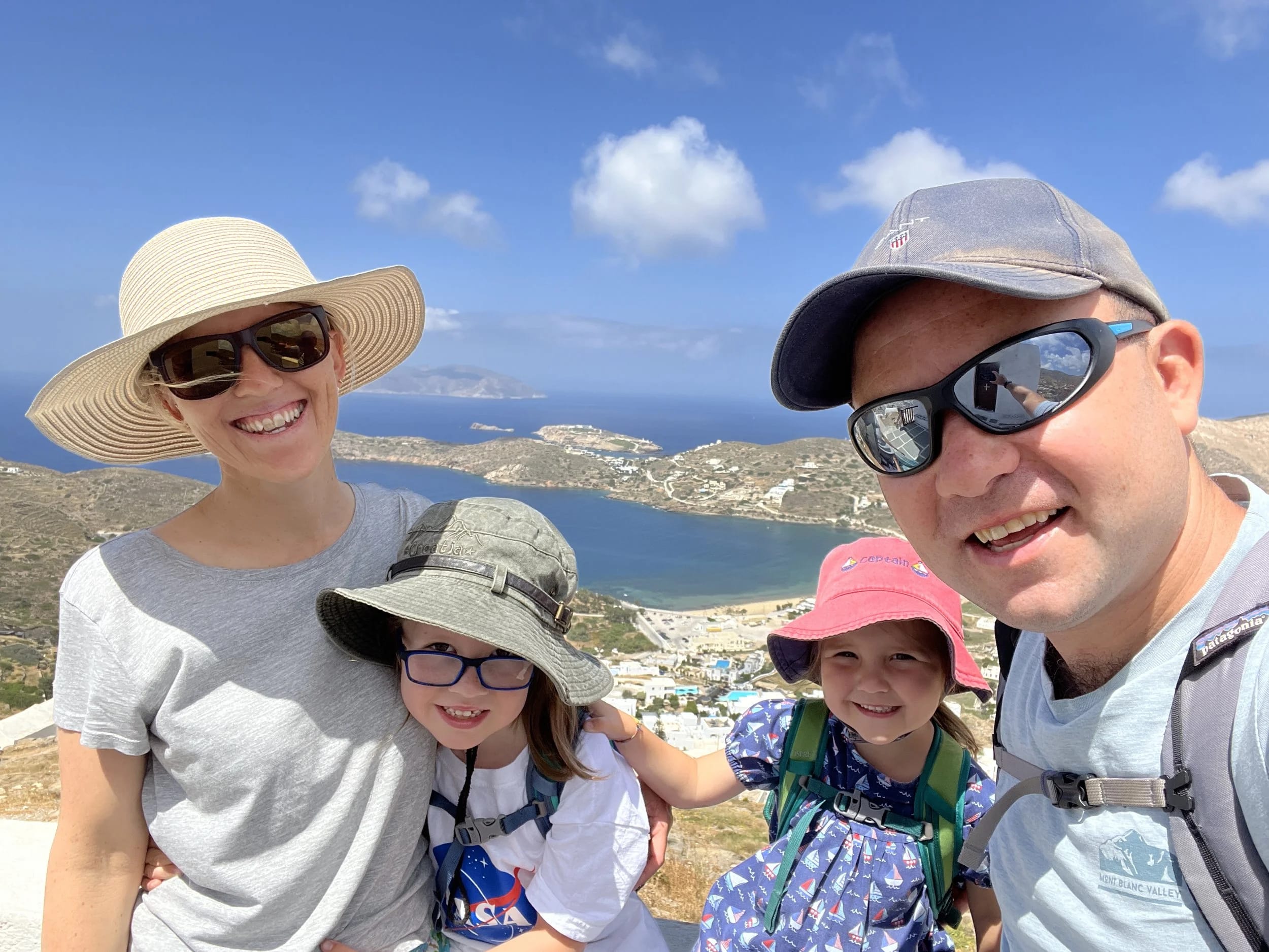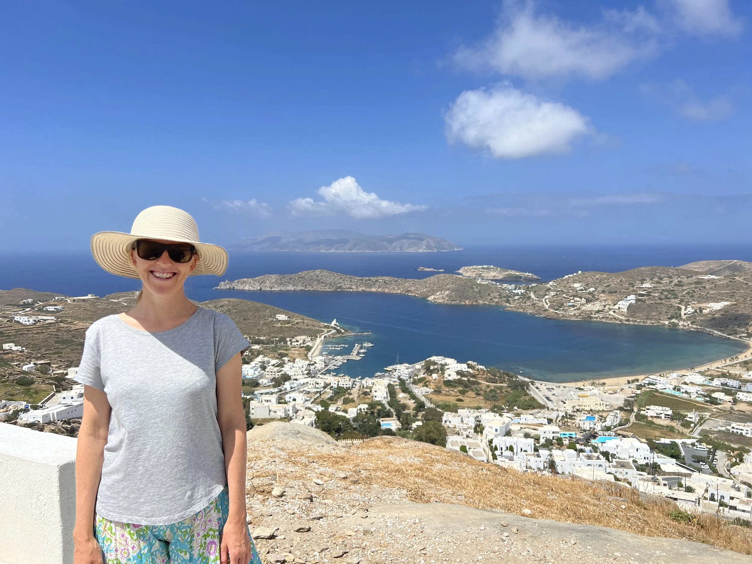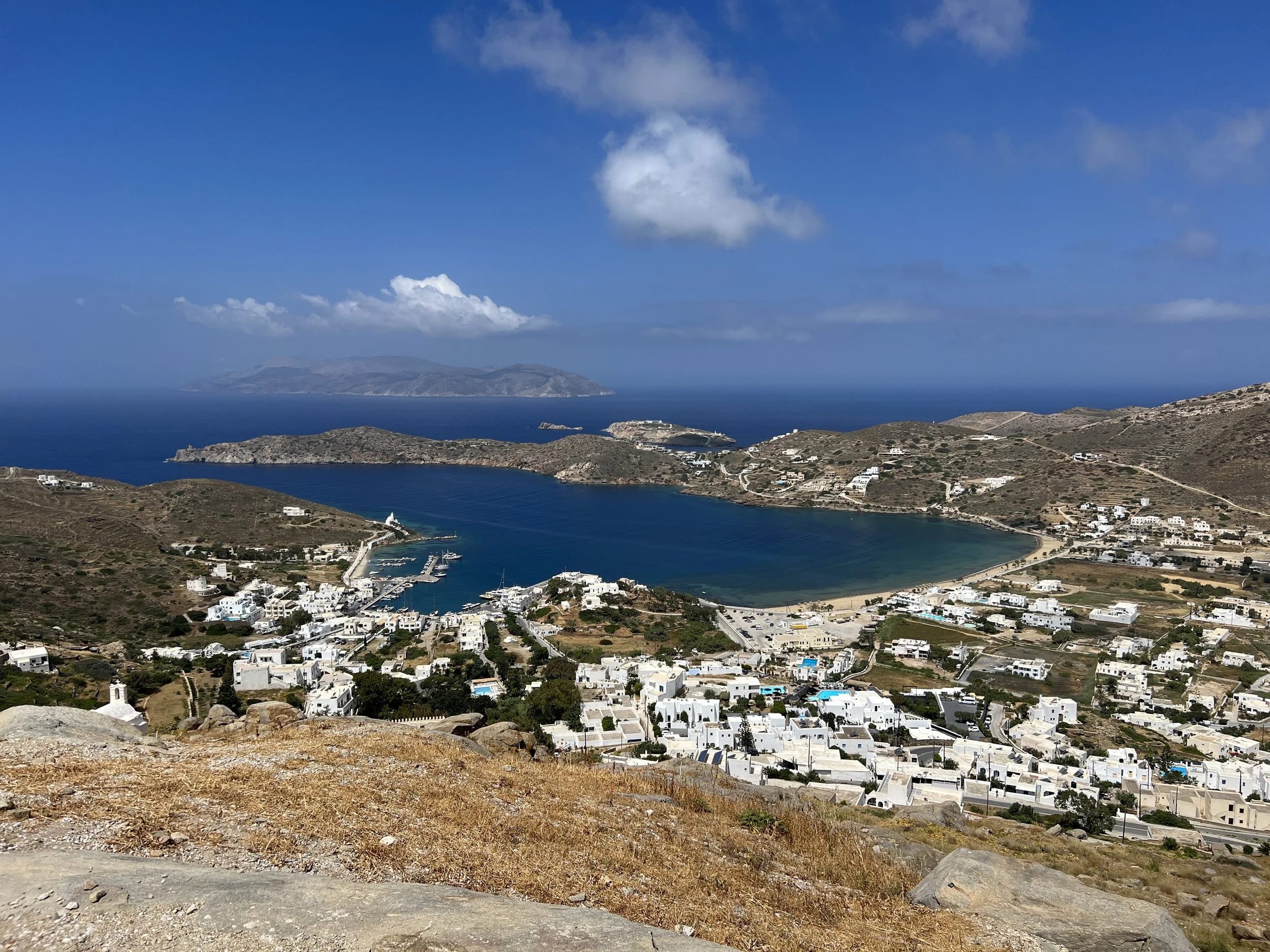 Here, perched high above the hillside (and only accessible by foot), a large blue-domed church and three small chapels stand overlooking the town and port below. And beyond an early Bronze Age settlement, Skarkos, we spied Long Summer down in the port. It was the perfect place to take in the amazing views of the harbour and islands beyond. We truly felt we were in the heart of the Aegean.