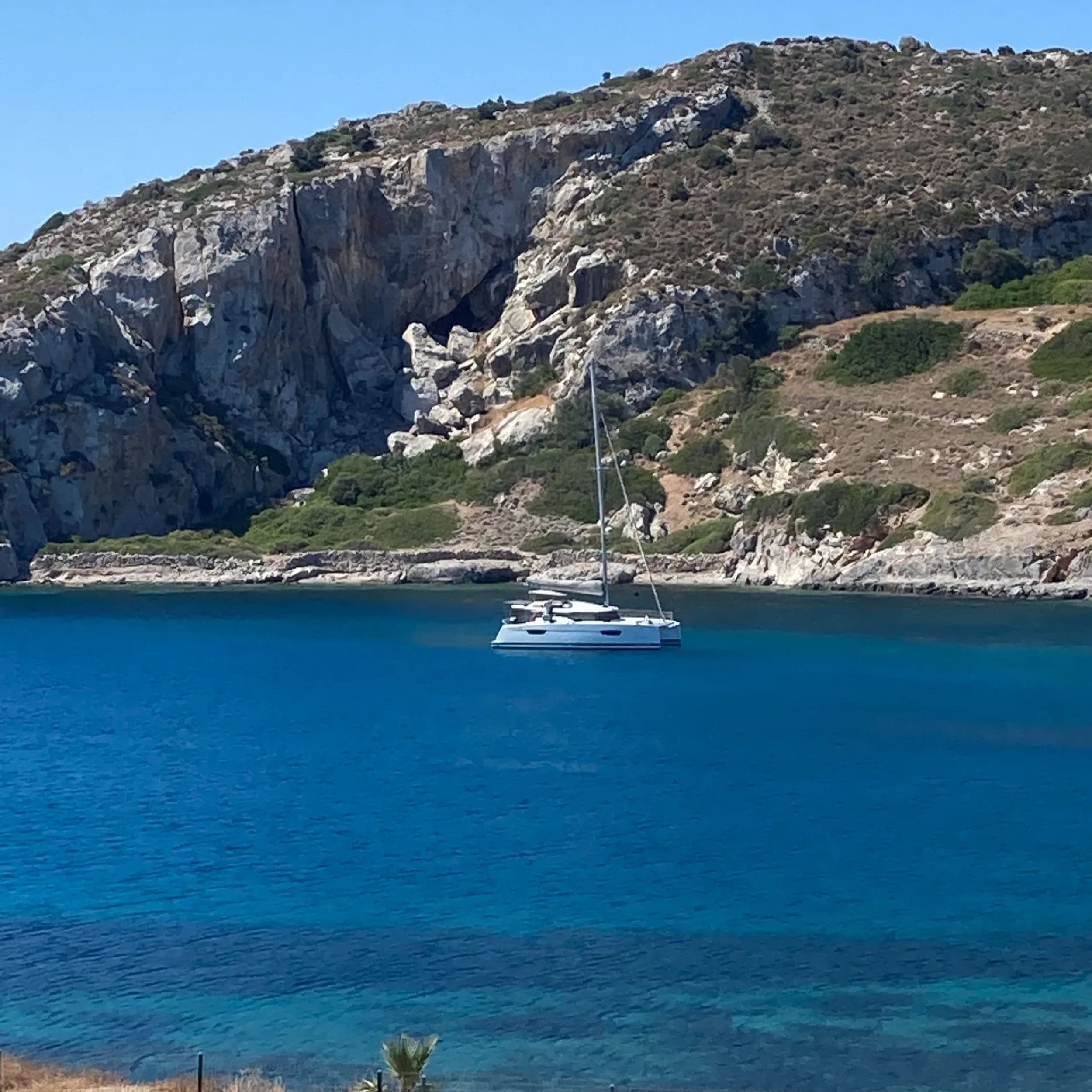 In a small bay at the end of a peninsula on Turkey’s south-western coast, sit the ruins of the Ancient Greek city of Knidos. Care has to be taken entering the port here; the 2,600 year-old breakwater lies in rubble beneath the surface of the water. But the reward is worth the risk, and we anchored in the turquoise waters, under the gaze of columns and archways.