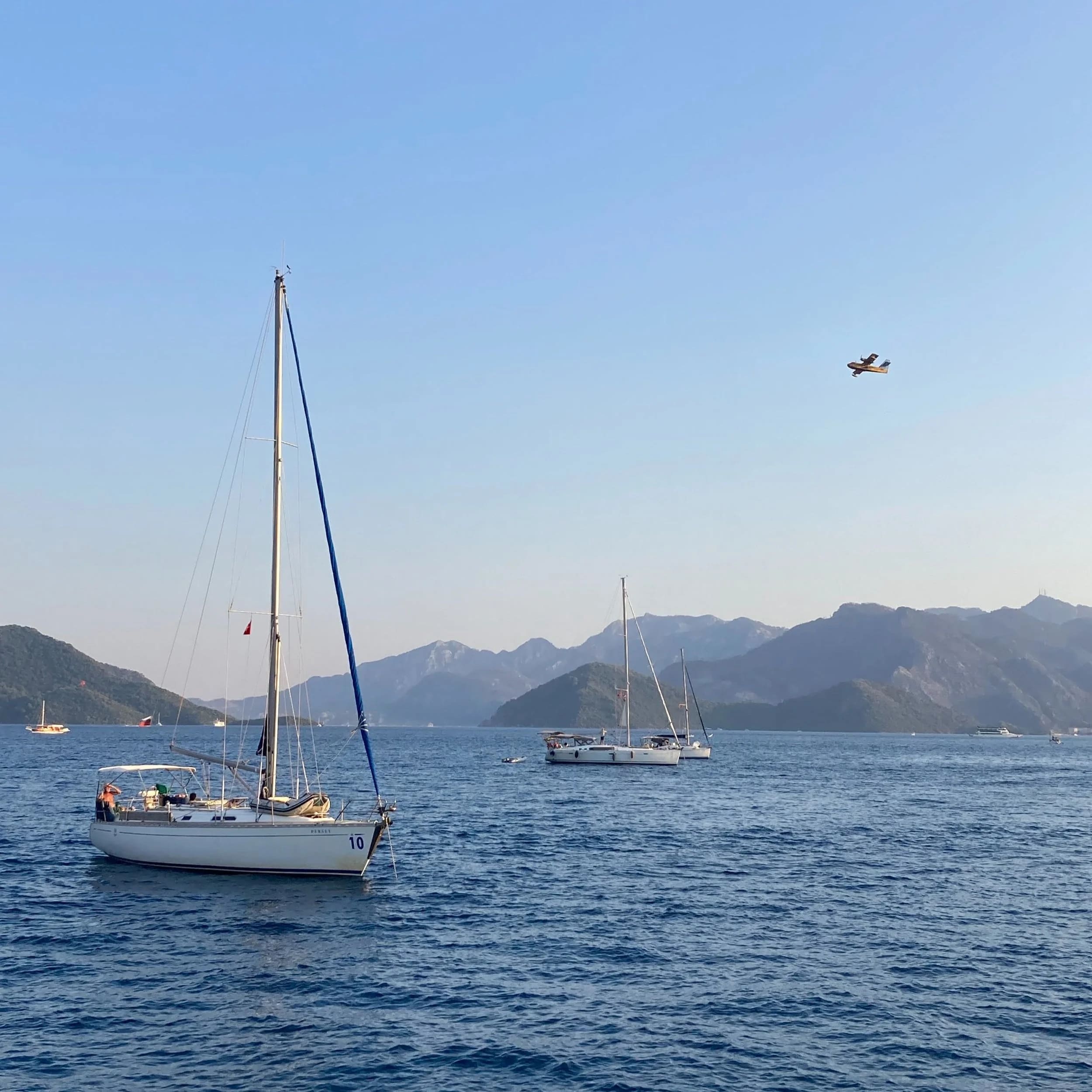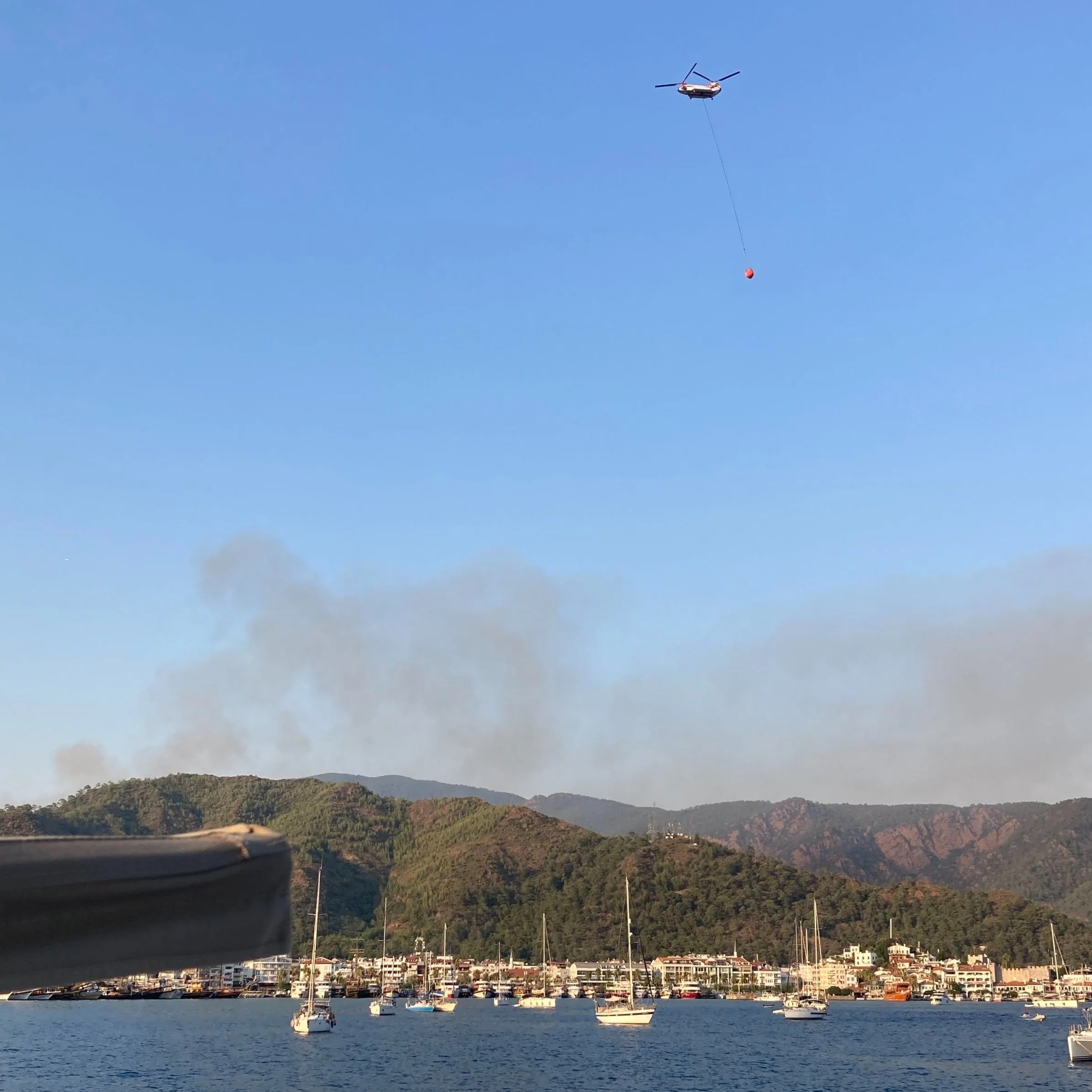 Soon the anchorage was swarming with tens of helicopters and aeroplanes. The coast guard cleared the bay so that Canadair aircraft, Chinooks and countless helicopters could scoop up gallons of water in order to attack the flames. Crop-dusters brought in extinguishing dust and a spotter plane kept watch from above. The level of co-ordination was impressive, and we spent nearly two hours watching these aircraft bounce between the bay and the fire, flying low over our mast with their buckets of water.