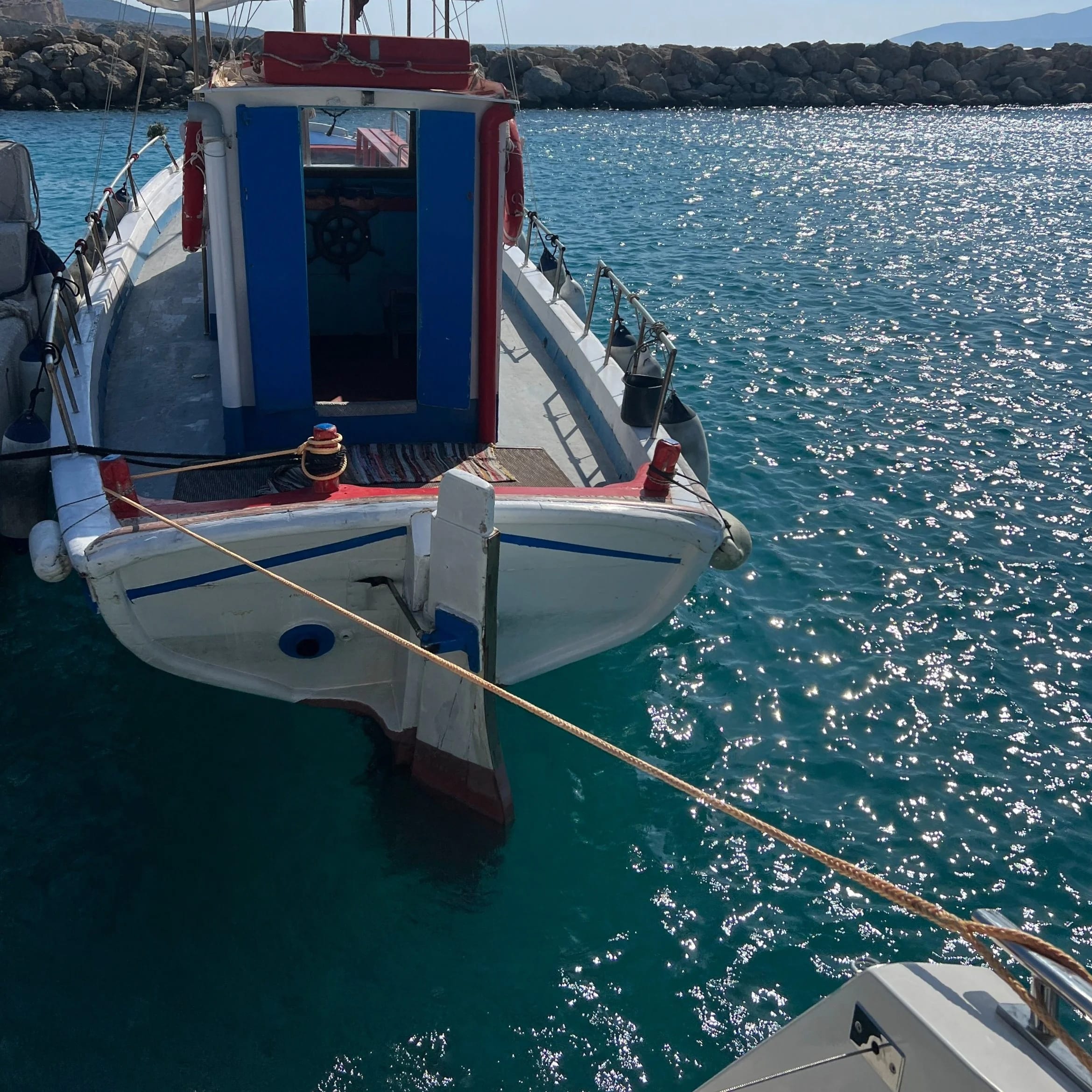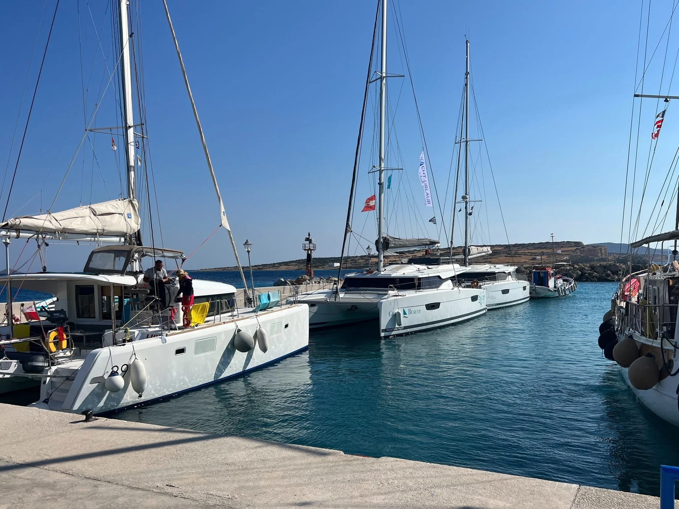 In Koufonisi, we came home from the beach one afternoon to find a local water taxi using our aft cleat as a mooring; it’s a busy harbour and the charter boats were in town. No big deal, we weren’t going anywhere in a hurry anyway. A short while later as a catamaran docked in front of us, they tried to pop their dinghy on our bow sprit. The winds were strong, but no damage was done - all good.