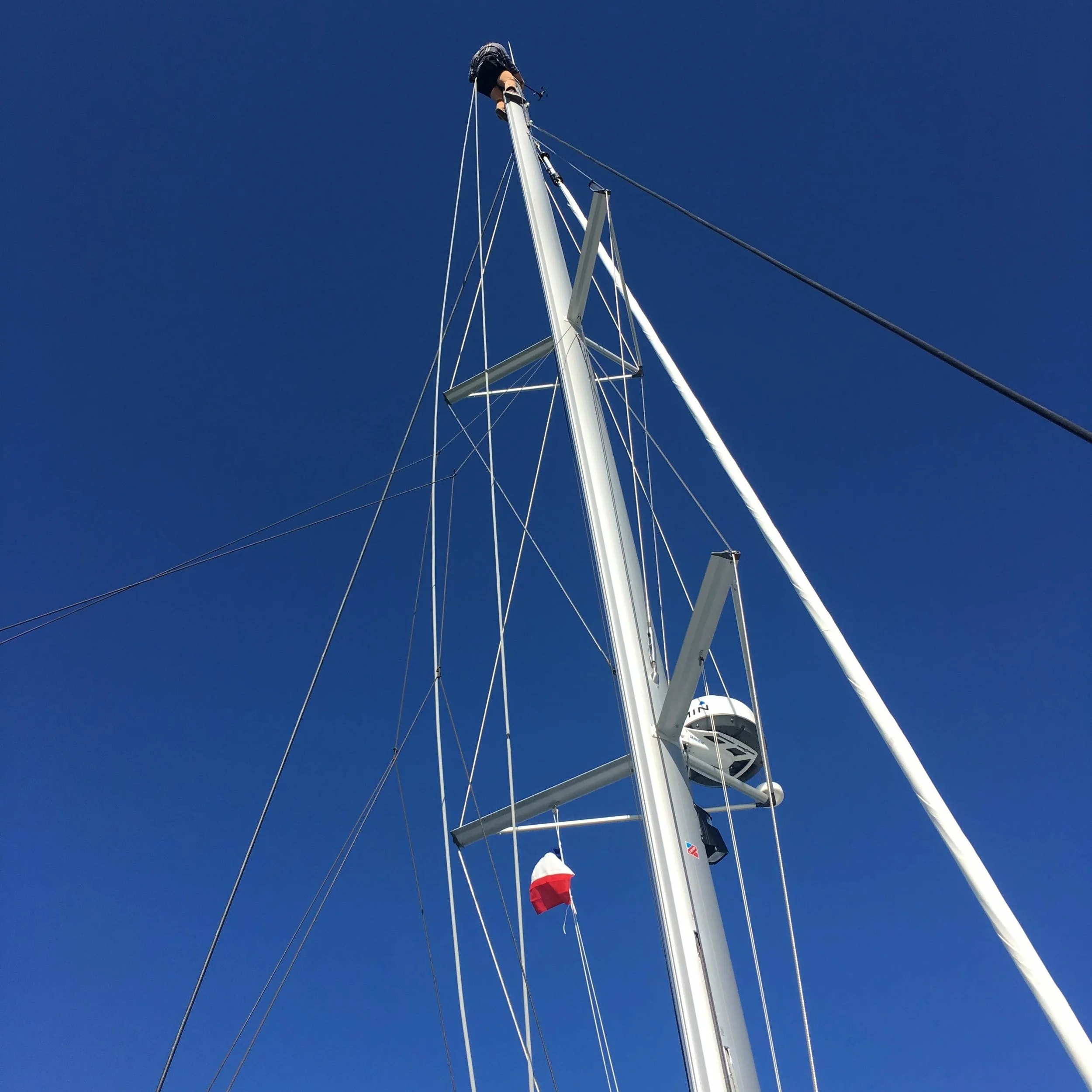 Day two of getting to know our boat started with a trip up the mast to fit the radar reflector to the second spreader. Not an easy task for most, but even more of a challenge for someone with a fear of heights... Nevertheless, Ben was keen to get stuck in and handled the task with relative ease - and he also didn’t mind too much when we sent him up to the very top of the mast rather than bringing him back down!
