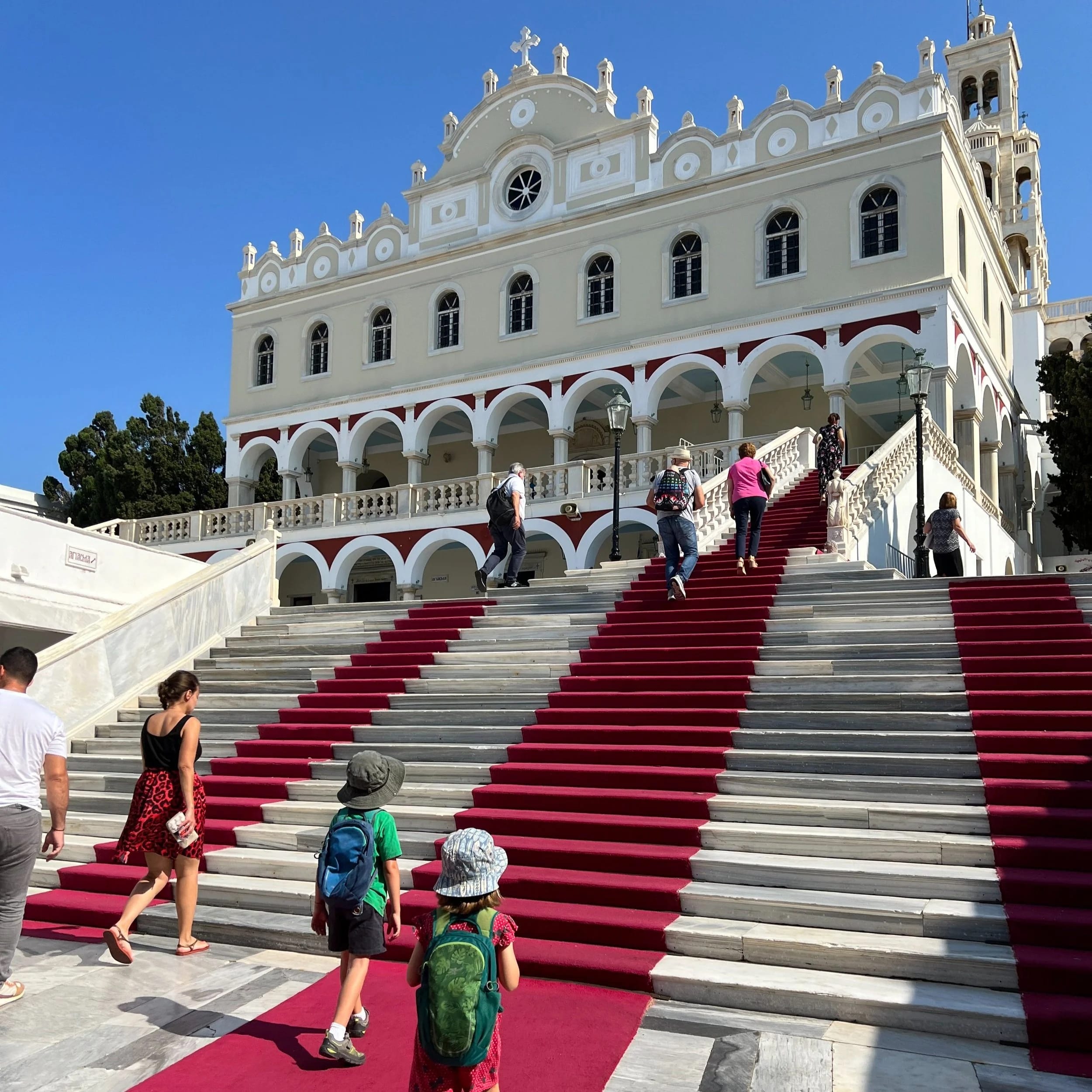 Above the town sits the Church of Panagia Megalochari, an impressive building made from local marble. This is the spiritual heart of Greece, and her most popular pilgrimage. Many pilgrims come here to crawl on their hands and knees from the port to the church along a red carpet that has been permanently installed along the route up the hill. It was an interesting sight to behold.