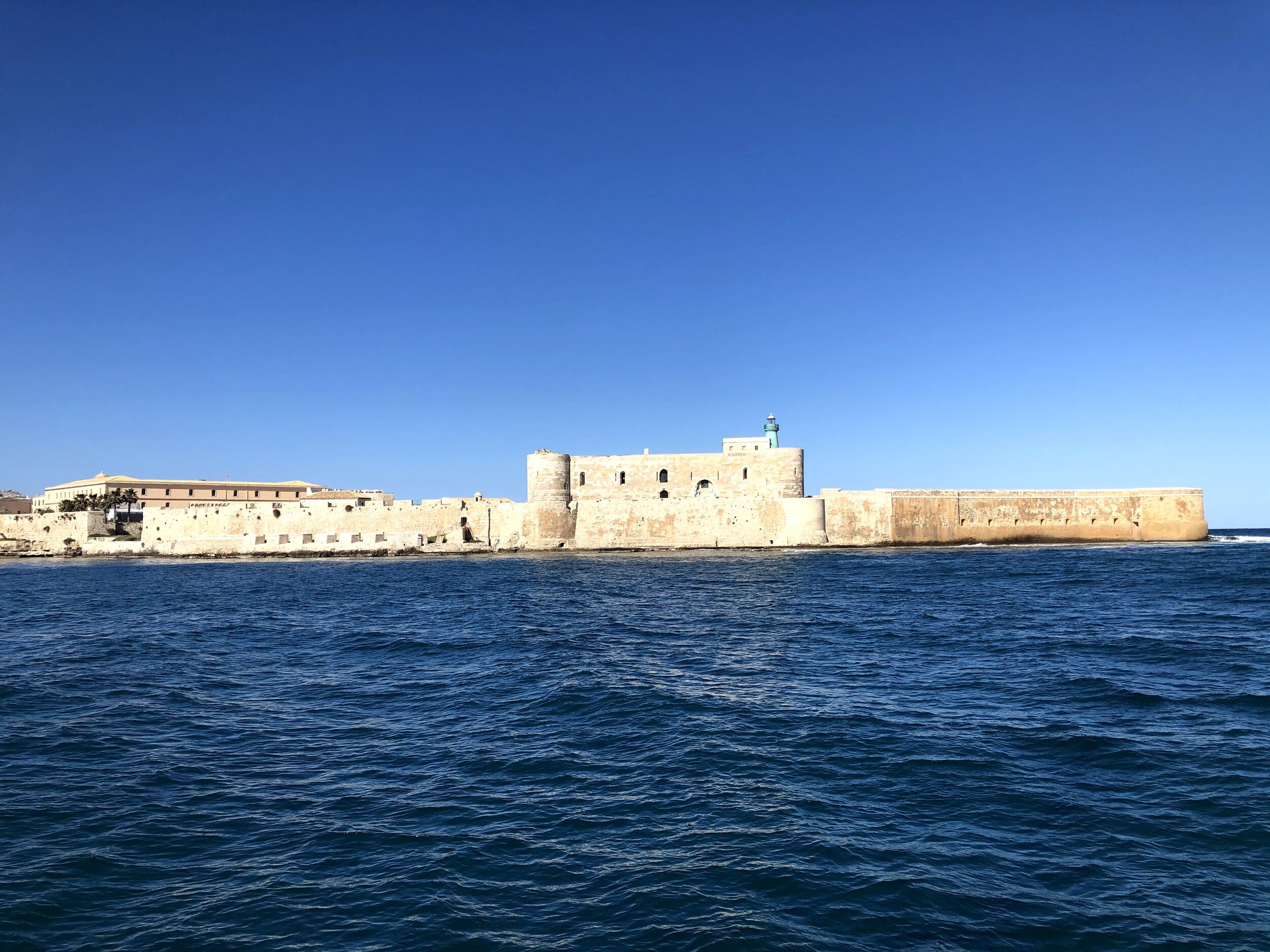 Entering into the harbour of Syracuse we also passed by the imposing Castello Maniace, a fortress that has stood guard here since 1240 CE. Located at the eastern end of the city of Syracuse, it actually sits on a promontory of Ortygia Island, that is separated by a narrow channel where two bridges connect it to mainland Sicily.